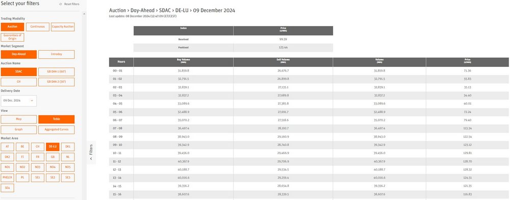 An der europäischen Energiebörse wird Strom am sogenannten Spotmarkt für den Bezug am Folgetag gehandelt. Der Handelspreis ergibt sich dabei anhand von Angebot und Nachfrage und kann stark schwanken. Die Börsenstrompreise können Sie am Vortag ab mittags für die 24 Stunden des Folgetages bei der EPEX SPOT einsehen. Wählen Sie auf der Seite der EPEX hierfür bitte folgende Einstellungen: